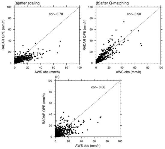 Scatter plot of hourly rainfall on 07 UTC 20 August 2020 between AWS and radar QPE (a) after correction by scaling, (b) after correction by Q-matching, and (c) before correction. The horizontal axis represents AWS rainfall, and the vertical axis represents radar QPE. The correlation coefficient is also shown.