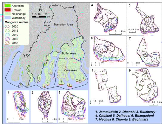 Analysis of the multi-temporal Landsat data from 2000 to 2020 showed significant erosion in the core and buffer areas (Figure 2) of the mangrove forest, accompanied by an increase in the transition area within human habitation. Around 110 km2 of mangroves were lost and 81 km2 gained in the SBR, corresponding to average losses and gains of 5.5 km2/year and 4.1 km2/year, respectively. The core area of the mangrove forest lost 58 km2 (2.9 km2/year), the buffer area lost 52 km2 (2.6 km2/year), while 81 km2 (4.1 km2/year) were gained in the transition area outside the contiguous mangrove area (Table 1). The rate of mangrove change was not uniform over time; the maximum loss rate was observed from 2000 to 2005 with losses of 4.5 km2/year in the core area and 3.4 km2/year in the buffer area, while maximum accretion was observed from 2015 to 2020 (7.7 km2/year).