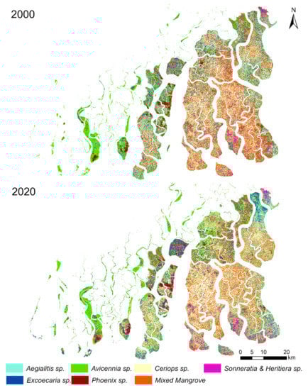 Distribution of dominant mangrove communities of the Indian Sundarbans in 2000 and 2020.