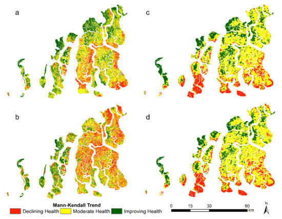 Trends in vegetation indices in terms of improving health and declining health from 2000 to 2020 using the Mann–Kendall test on EVI and NDVI, derived from Landsat and Modis data ((a)—Landsat NDVI MK test; (b)—Landsat EVI MK test; (c)—MODIS NDVI MK test; (d)—MODIS EVI MK test).