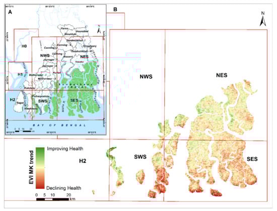 Comparison between salinity zones and mangrove health (MODIS EVI MK test). (A) the inset map showing the different salinity zones in SBR and (B) the spatial variability of EVI MK.