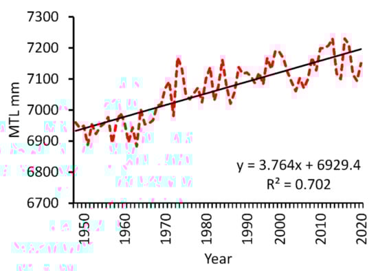 Given its location on a major delta, the Sundarbans is exposed to both absolute sea-level rise and subsidence [80]. Tide gauge records in the northern Bay of Bengal show strong interannual variability in mean sea level associated with El Niño Southern Oscillation (ENSO) and Indian Ocean Dipole (IOD) influences, as well as variation river flow [81]. The longest and most complete of the Indian records is for Diamond Harbor on the Hugli estuary, which shows a linear trend of 3.75 mm/year for the period 1948–2020 (Figure 6). The tidal range here is approximately 5 m and the record also contains some variation at the scale of the 18.6-year nodal cycle. The sea-level rise trend at Diamond Harbor is broadly consistent with a trend in absolute sea-level of 3.11 ± 0.44 mm/year in the northern Bay of Bengal for the period 1993–2010, determined from analysis of satellite altimetry data by Ghosh et al. [82]; however, this can be assumed to include a contribution from subsidence as well. Subsidence is known to be significant but spatially variable across the delta [81,82]. Reliable data are sparse, but most estimates for the western part of the delta (including the Sundarbans) are around 2.5 to 4 mm/year [83,84,85], and this needs to be added to estimated (or projected future) change in absolute mean sea level in the region to evaluate the likely impact on the delta and its ecosystems. These impacts can be expected to include an increased tendency towards shoreline erosion (especially on ocean-facing islands in the delta), increased inundation, and more extensive influence of marine salinity.