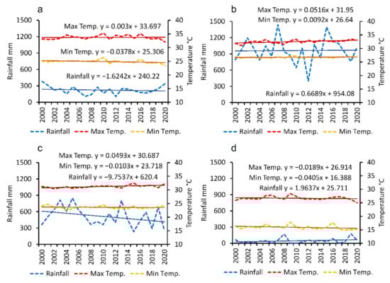 Annual rainfall, maximum temperature and minimum temperature variability in (a) summer, (b) monsoon, (c) post-monsoon, and (d) winter season during 2000–2020 in the SBR.