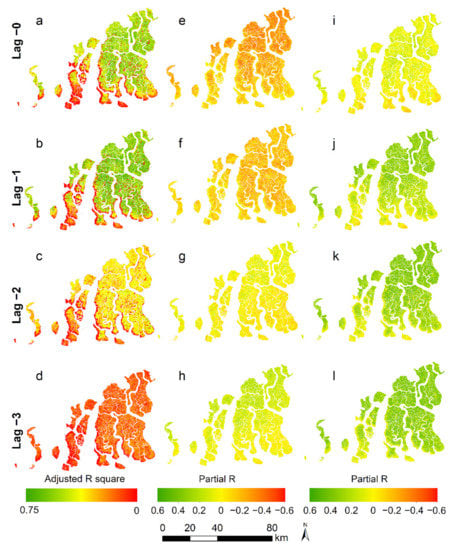 Adjusted R square (a–d), partial R EVI-rainfall (e–h), and EVI-maximum temperature (i–l).