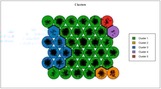 SOM algorithms map high-dimensional data patterns to an output space or n-dimensional grid where this output space is usually two-dimensional, and the grid of units may be rectangular or hexagonal []. This process is an unsupervised machine learning technique, which preserves the topological relationships within the dataset, and broadly, requires two steps, training and mapping. The training process of a SOM creates a two-dimensional input space comprised of neurons (or nodes), and the distance between the dataset neurons and the input space pattern is determined. The neurons that are closest to the input space pattern are selected as winning neurons. The mapping process takes the input space pattern and maps it to the winning neurons, or to other close neurons in the output space. SOM is useful for examining and grouping high dimensional data into clusters, as well as visualizing the analysis through topological maps, and in this study, applying the SOM results to spatial maps [,]. For a more detailed description of the SOM algorithm the reader is referred to [].