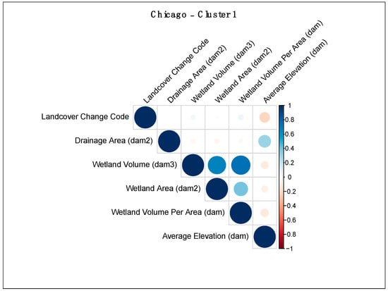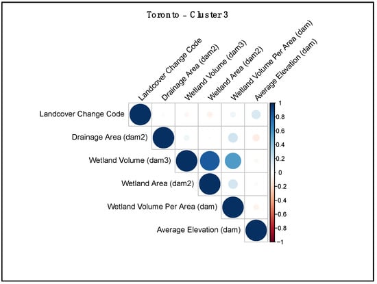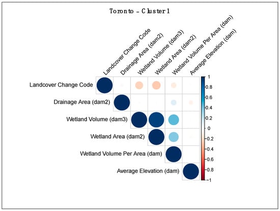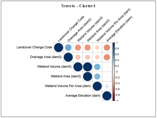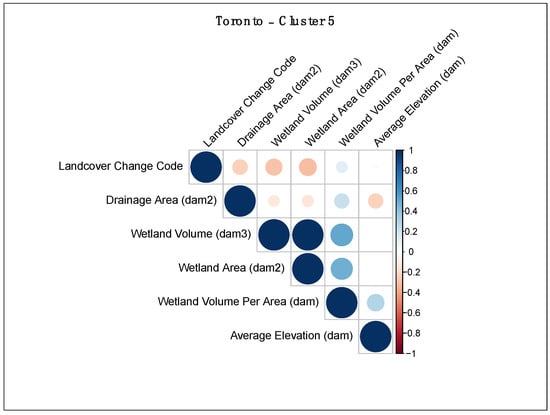The correlation matrix for Cluster 1 (Figure 2) shows that (1) landcover change has a weak negative correlation with wetland volume, wetland area, and volume per area, indicating that wetland areas where more intense landcover change has occurred tend to be areas with smaller, shallow wetlands that have a lower water storage capacity per area. (2) Drainage area has a weak positive correlation with wetland volume per area, indicating that in this cluster, during rain events, more water tends to flow into wetlands with a higher water storage capacity per area. For the city of Toronto, this correlation matrix (Cluster 1), as well as in the correlation matrices for clusters 2–5, wetland volume, wetland area, and wetland volume per area are positively correlated.