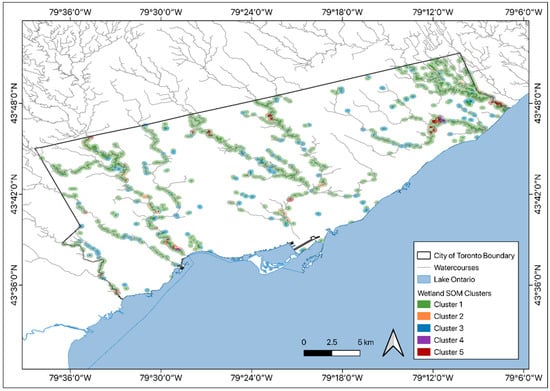 The spatial distribution of the city of Toronto wetland areas by SOM cluster is shown in Figure 7. Wetland areas in cluster 1 tend to be densely concentrated along watercourses throughout Toronto; however, this cluster does contain several wetland areas that are geographically isolated and removed from the urban watercourses. Wetland areas in cluster 2 are geographically dispersed but are all located along the Humber River and Don River watercourses throughout Toronto. Wetland areas in cluster 3 are located both along watercourses throughout Toronto, as well as in geographically isolated areas, removed from the urban watercourses. Wetland areas in cluster 4 are geographically dispersed and are located on the Humber River, Rouge River, and Highland Creek watercourses, with a single, geographically isolated wetland area removed from the urban watercourses, located near the city’s centre. Wetland areas in cluster 5 are somewhat geographically dispersed but are all located along the Humber River, Don River, Rouge River, and Highland Creek watercourses throughout Toronto. There is some dense clustering of wetlands along the northern Don River, southern Rouge River, and along Highland Creek. Broadly, although clusters 4 and 5 contain the lowest numbers of wetland polygons, these wetlands tend to be much larger both in area in volume, compared to wetlands in clusters 1, 2, and 3.