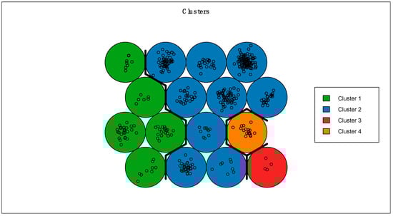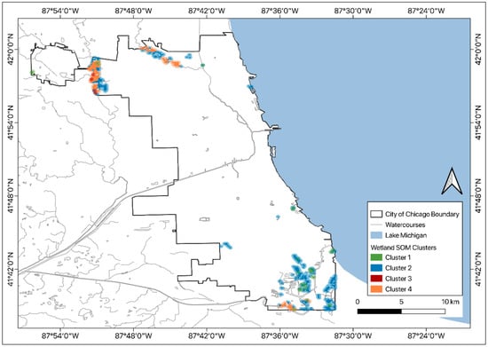 The results of the SOM analysis for the city of Chicago are included in Figure 8. Clusters 1 and 2 are the dominant clusters, with the highest number of wetland polygons included in cluster 2. Clusters 3 and 4 have the lowest number of wetland polygons, with a low number of wetland polygons included in cluster 3.