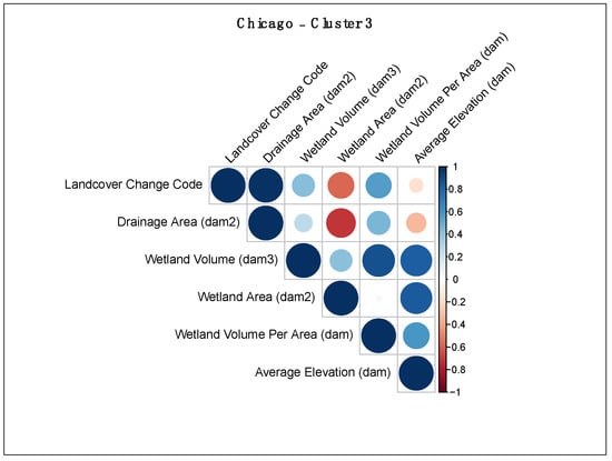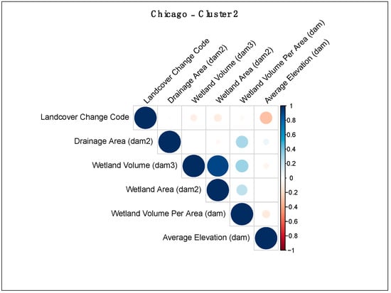 The correlation matrix for cluster 1 (Figure 9) shows that (1) average elevation has a weak negative correlation with landcover change wetland volume, wetland area, and wetland volume per area, indicating that wetland areas at a high elevation tend to be smaller and shallower wetlands located in areas where little to no landcover change has occurred. (2) Average elevation has a positive correlation with drainage area, indicating that in this cluster, during rain events, more water tends to flow into wetlands wetland areas at a high elevation. (3) Wetland volume, wetland area, and wetland volume per area are positively correlated with each other.