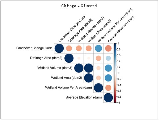 The correlation matrix for Cluster 4 (Figure 5) shows that (1) landcover change has a fairly strong positive correlation with drainage area and fairly strong negative correlation with average elevation, indicating that areas where more intense landcover change has occurred tend to be wetland areas that have a larger drainage area and are located at lower elevations. Landcover change is also negatively correlated with wetland volume and wetland area, and there is a weak negative correlation between landcover change and wetland volume per area. This indicates that wetland areas where more intense landcover change has occurred tend to be comprised of smaller and shallow wetlands that have a somewhat lower water storage capacity per area. (2) Drainage area has a weak negative correlation with wetland volume, wetland area, and wetland volume per area, as well as a negative correlation with average elevation. This indicates that wetland areas with higher drainage areas tend to be comprised of smaller and shallow wetlands with a lower water storage capacity per area that are located at a lower elevation.