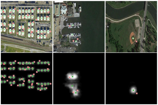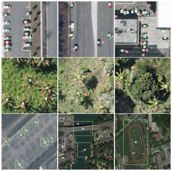 Corrected labels for examples of the COWC (first row), PalmTrees (second row), and NWPU VHR-10 (third row) dataset. Original noisy and refined labels are marked with red and green crosses, respectively. For the NWPU VHR-10 dataset, we additionally depict our estimated bounding boxes. Best viewed in color.