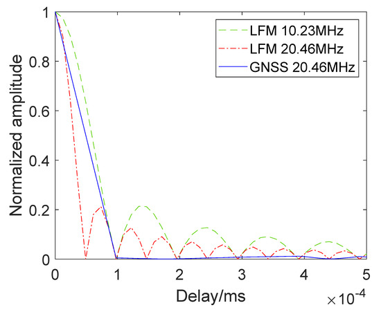 In this part, we study the resolution performance of the BDS signal. As shown in Table 1 in the simulation section, the B3I signal is transmitted with a bandwidth of 20.46 MHz. Figure 3 shows the autocorrelation curves of the B3I signal and two chirp signals with bandwidths of 10.23 MHz and 20.46 MHz.