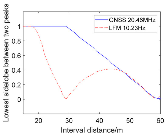 Next, we studied the sidelobe between the two target peaks of the B3I signal detection curves. Figure 5 shows the normalized sidelobe peak curves between two target peaks of the GNSS B3I signal as the distance between two targets. We found that the sidelobe peaks gradually decreased until the distance was more than 30 m, and in the range of 30~60 m, they had a linear decline as the distance increased. The results show that the GNSS B3I signal can realize a clear target peak resolution with an interval of targets near 30 m. After further simulation, we found that 33 m is the suitable interval for B3I signals with clear and smaller peak resolutions.