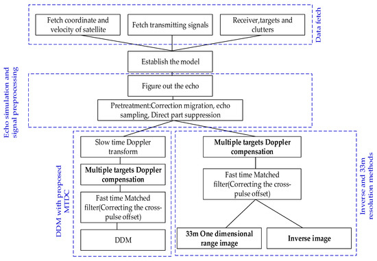 Figure 6 shows the experimental technical scheme of multiple targets and multiple-GNSS-R-signal detection. The technical route of the detection can be divided into three parts: (1) The BDS MEO satellite information can be obtained from the database [29] and the signal can simulate the parameter, as observed in the literature [27,28]. We found the ship model using the physical optics scattering method and simulated the sea clutter with the weibull distribution model; (2) After establishing the detection model, the echo was simulated and preprocessed. Where the echo was sampled, the distance migration and velocity migration were corrected, and the direct part of echo was suppressed; (3) For the third part, we simulated the DDM, 33-meter one-dimensional range image, and inverse image with multiple-target Doppler compensation, 33-meter peak identifying methods, and inverse methods. The proposed method has been bolded in the picture.