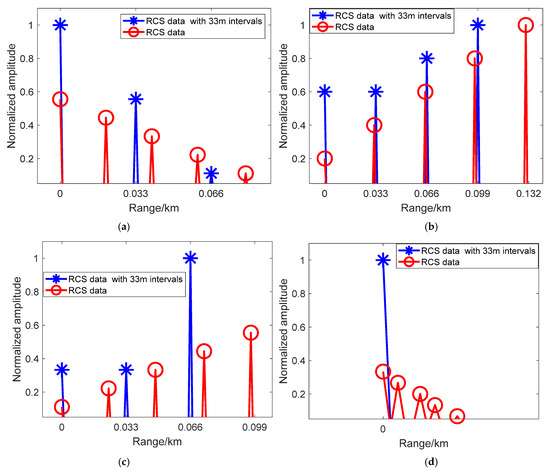 To study the target peak resolution effectiveness of the sampling method at 33 m, Figure 8 and Figure 9 show the RCS data distribution and one-dimensional range detection results with sampling at 33 m. In Figure 8, the circle line expresses the original RCS distribution of point target 3 under each satellite, and the star line represents the data with a sample at 33 m. In Figure 9, the curves are the detection peaks of point target 3 under each satellite, and its direction and length vary with the detection angle. Taking Figure 8 as a comparison, we found that the small peaks in the detection results of Figure 9 are in good agreement with the sampling data at 33 m in terms of amplitude and range point. The results can be utilized to estimate the RCS distribution of targets and verify target recognition.