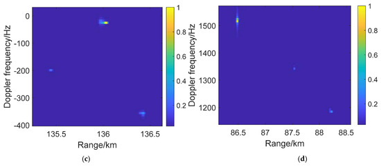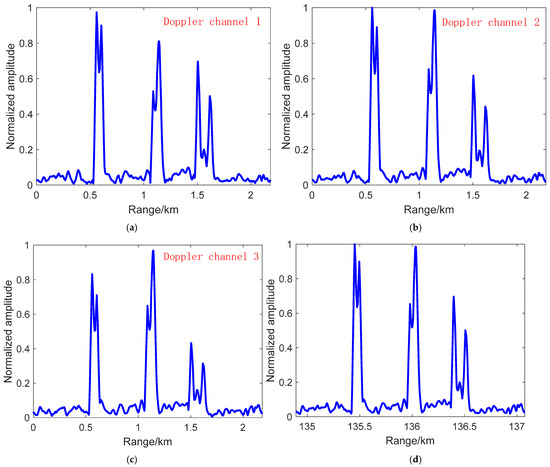 In Figure 11 and Figure 12, we show the Doppler compensation effectiveness comparison of the two compensation methods. In Figure 11, we simulated the one-dimensional range detection compensated results of three ship targets without target estimation information, and the results are compensated for with single Doppler channels and the MTDC method. Figure 11a–c show the incomplete peak amplitudes of three ship targets, and Figure 11d shows the target peaks without Doppler phase influence, which shows the effectiveness of MTDC in estimating no-target information situations. Figure 12 shows the compensation results with acquired target estimation information. Figure 12a–c show that each target peak can return to the normal level under the corresponding Doppler compensation and that other target peaks lose part of their amplitudes. Figure 12d shows the MTDC method compensation results expressing all target peaks, obtaining their maximum level. The results of Figure 11 and Figure 12 verify that the proposed MTDC method can remove the Doppler phase influence of multiple target detection.