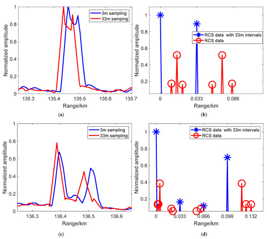 In BDS-R detection, the echo intervals are smaller than the resolution of the B3I signal, and in the case of bistatic detection, intervals of targets vary with the bistatic angle. To acquire a clear and stable resolution, we propose sampling the echoes with an interval of 33 m, and the RCS data for comparative verification can also be processed with an interval of 33 m.