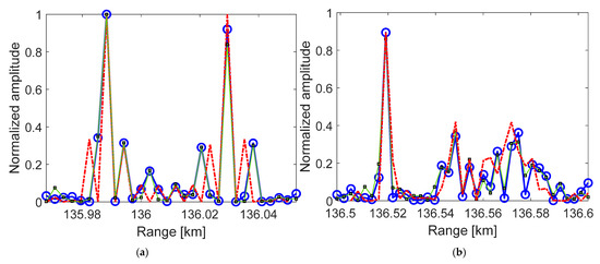 In this section, we study the peak inversion methods. For the limited resolution problem, we propose a correlation peak inversion method to determine the specific range information of targets based on one-dimensional detection data and the corresponding signal autocorrelation function. Moreover, the inversion result accuracy is related to the sampling frequency of the echoes. We propose two methods to find the approximate ranges of target positions in the time domain. In method 1, without target estimation information, we found the range as follows: (1) Acquiring matched filter results, we filtered it with a normalized amplitude > . (2) Next, we divided the results into small segments, between each pair of segments. There is a low amplitude period with a length of , where and can be utilized to adjust the target range for better adaptability of detecting targets. In method 2, we can obtain the rough target position in the echoes by rough detection. The inversion ranges can be expressed as Range = , and the corresponding sampling points can be expressed as N = . The inversion in can be expressed as