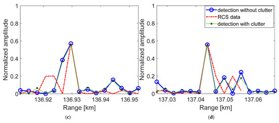 One-dimensional range detection results of point target 3 under the detection of 4 BDS satellites with 33-meter echo sampling: (a) satellite 1; (b) satellite 2; (c) satellite 3; and (d) satellite 4.