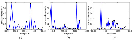 Figure 12, Figure 13, Figure 14, Figure 15 and Figure 16 show the one-dimensional range image Doppler compensation results, one-dimensional range image target peak identification results, range inverse results, and DDM results of three ship targets in simulation 2, which verify that multiple fetched ship targets can be detected with better strength using the MDTC method with noise and sea clutter backgrounds in a 10 s accumulation, and the ship RCS distribution structure can be further acquired by the proposed target peak identification method and range inversion method.