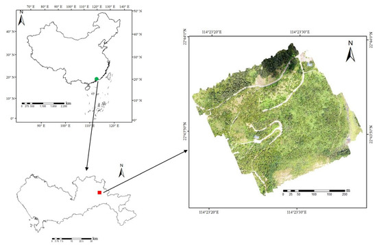 The study area is located on Julongshan Park, a subtropical broadleaf forest situated in Shenzhen in southern China (Figure 1). The center coordinates of the study region are 114°23′28″E and 22°43′50″N. The topography of the study region is plain, with a mean altitude of 64 m. The climate is subtropical maritime, with an annual average temperature of 22.4 °C and an annual rainfall of 1933.3 mm. There are several tree species in the study area, such as Terminalia mantaly, Elaeocarpus grandifloras, Litchi chinensis, Lagerstroemia speciosa, Acacia mangium, and Cinnamomum camphora. Due to the limitations of field accessibility and sample number, this research was only conducted on Terminalia mantaly which accounted for about 50% of total individuals.