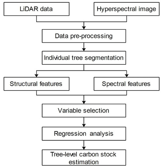 Tree-level carbon stocks were estimated by UAV LiDAR and hyperspectral data. The procedure consisted of three main steps: (1) individual tree segmentation; (2) tree-level structure and spectral features extraction; and (3) tree-level carbon stocks estimation (Figure 2).