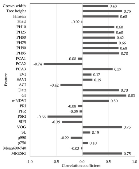 Pearson correlation analysis was carried out to explore the relationship between each remote sensing feature and control data. The correlation coefficients between LiDAR features, hyperspectral features, and control data are plotted in Figure 4. Nine of the ten LiDAR features, including crown width, tree height, Hmean, the height percentiles of point clouds, had positive correlations with control data. All of the above had correlation coefficients larger than 0.48. Only one LiDAR feature, i.e., Hstd, had no correlation with control data. For all the LiDAR features, tree height had the highest correlation with control data (r = 0.75), followed by PH95 (r = 0.70) and PH90 (r = 0.68). Among the 19 hyperspectral features, six features (PCA3, Datt, GI, mNDVI, VOG, and MRESRI) had positive correlations greater than 0.5 with control data, and four features (PCA2, ACI, PSRI, and SIPI) had negative correlations lower than -0.3 with control data. For all hyperspectral features, GI had the highest correlation with control data (r = 0.83), followed by VOG (r = 0.75) and MRESRI (r = 0.75).