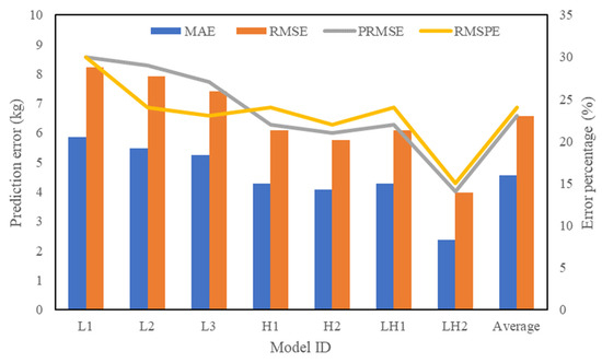 Beyond the coefficient of determination, four accuracy statistical indices, MAE, RMSE, PRMSE, and RMSPE, were calculated to evaluate the bias of tree-level carbon stock estimation models. As shown in Figure 5, the MAE of the four models ranged from 2.36 kg to 5.86 kg with an average value of 4.55 kg. The RMSE ranged from 3.98 kg to 8.21 kg with an average of 6.56 kg. The PRMSE ranged from 14% to 30% with an average of 23%. The RMSPE ranged from 15% to 30% with an average of 24%. Among the three kinds of tree-level optimal carbon stock estimation models, the combined model (LH2) had the lowest bias, with a MAE of 2.36 kg, RMSE of 3.98 kg, PRMSE of 14%, and RMSPE of 22%. The bias of hyperspectral-derived optimal model (H2) was in the middle, with MAE of 4.08 kg, RMSE of 5.76 kg, PRMSE of 21%, and RMSPE of 22%. The LiDAR-derived optimal model (L3) had the highest bias, with MAE of 5.24 kg, RMSE of 7.42 kg, PRMSE of 27%, and RMSPE of 23%.