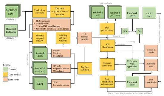 Our research aims to develop a new machine learning (ML) workflow using big remote sensing data to distinguish between three (3) different grassland classes (i.e., native, tame, and mixed) across 86,300 km2 in Saskatchewan, Canada. Our specific objectives were to (1) find the best temporal window showing a distinction between native, tame and mixed grasslands using time series data of MODIS NDVI over 17 years; (2) establish a big data reduction technique to select from 78 calculated raster variables derived from various remote sensing sensors to classify native, tame and mixed grassland pixels; (3) examine the classification accuracy of a random forest (RF) classifier built from the results from step 2; (4) produce a high-resolution map of native, tame, and mixed grasslands of the Saskatchewan Mixed Grassland ecoregion (MGE); and (5) assess grassland amounts among MGE landscapes with different soil properties, climate conditions, and topography.