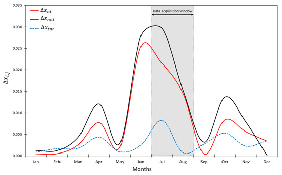where is the NDVI average of the month for the years 2001–2018 for the classes native, tame and mixed, and is the total absolute average for each month. The higher will be used as the base time for Sentinel-1 and Sentinel-2 data acquisition. The second filter is the availability of data with cloud coverage <5%, which is more applicable to Sentinel-2 as optical remote sensing.