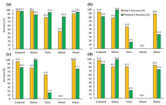 The accuracy assessment of the MGE classification, User’s Accuracy (%): This value represents the probability of a classified pixel into a given category represents that category on the ground, and the Producer’s Accuracy (%): This value represents how well reference pixels of the ground cover type are classified; (a) PLI classification; (b) AAFC 2017; (c) AAFC 2018; and (d) AAFC 2019.