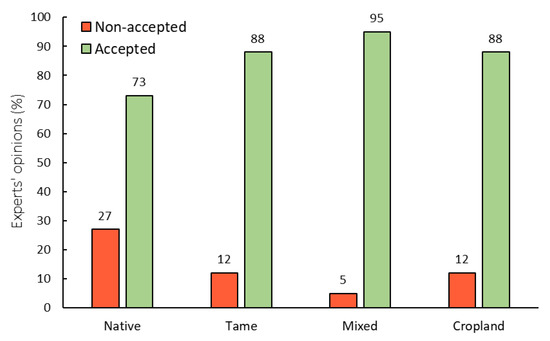 The confusion matrix was used to compare the classified classes against the reference ground-truthing. Additionally, AAFC land cover maps for 2016, 2017, and 2018 were used in this assessment. Our classification has an overall accuracy of 90.2%, and AAFC has a 7–10% classification accuracy lower than ours. Cropland, Water, Tame classes have the highest Producer’s Accuracy as 97.21%, 95.16%, and 93.8%, respectively (Figure 5a). The native grassland 98.20% had user’s accuracy and 88.40% producer’s accuracy. The mixed grassland class has the lowest overall accuracy (82.83%) and very low user’s accuracy (45.8%); the AAFC maps of 2016, 2017, and 2018 have not provided this class which was noted in our research as non-classified data (NCD; Figure 5b–d). The second assessment approach using the PLI Review Web Application represents the experts’ opinion (nine professional ecologists at just over 1500 sites) which is another direction to discover and learn the strength and weaknesses of our prediction model; this assessment was conducted using only the native, tame, mixed, and cropland classes as they represent the dominant vegetation landscape classes in the case study. The average expert’s opinions (%) agreed with 73% for the Native class, 88% for the Tame class, 95% for the Mixed class, and 88% for the Cropland class (Figure 6).