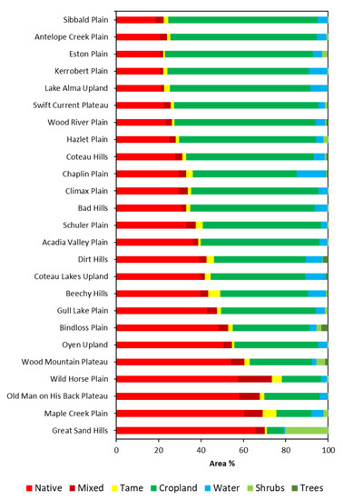- Gauthier, D.A.; Patino, L.; McGovern, K. Status of Native Prairie Habitat, Prairie Ecozone, Saskatchewan; Project Report to Wildlife Habitat Canada, Number 8.65A.1R-01/02; Canadian Plains Research Centre: Regina, SK, USA, 2002; 355p. [Google Scholar]