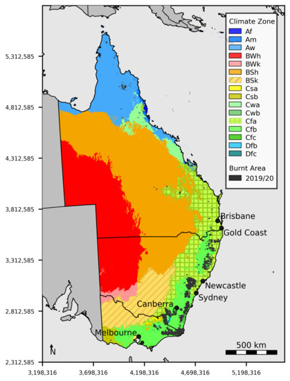 Note that, apart from the temperate zones featuring dry winters and warm to hot summers (Cwa/Cwb), all climate zones existing in the Eastern part of Australia are affected by wildfire.