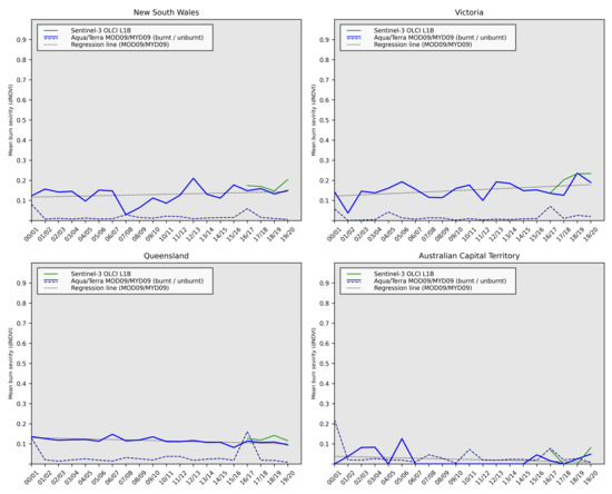 Figure 5 shows the yearly trend of average burn severity for the four analyzed states and territories. The green line depicts the severity results regarding Sentinel-3 OLCI, while the results for the MODIS data are depicted in blue. For the latter data source, not only the burnt areas have been investigated, but also the complete complementary area, which has not been affected by fire. This represents a cross check, showing that the developments in severity are not actually caused by unrelated factors such as climate, soil or moisture related conditions. It can be seen that the states of New South Wales and Victoria feature a general upward trend, while the development is stable or even decreasing for the ACT and Queensland.