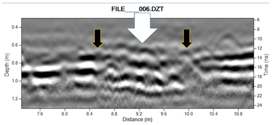 Possible builders’ trenches on both sides of the east wall (thick white arrow) at Mission Santa Clara seen as gaps (thinner black arrows) in horizontal strata to left and right in transect using the 400 MHz antenna.