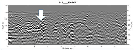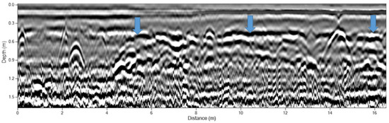 Quite different from the religious context of the missions and associated outpost described above, the Presidio San Francisco is located in the northwest corner of the city of San Francisco, just south of the Golden Gate and its iconic bridge, built 160 years later. The first quadrangle was built to house officers and soldiers associated with Mission San Francisco de Asis (Mission Dolores) and Yerba Buena. The adobe structures were reconfigured in the 19th century and some walls were incorporated into existing structures [23]. Ongoing excavations by the Presidio Trust have revealed intact, though partially dissolved adobe bricks underlain by a rubble foundation. Efforts by the National Park Service in 2009 to GPR survey buried adobe foundations at this location were unsuccessful despite the known location of features and good surface conditions. In 2017, we established a single GPR grid over an area likely to hold the outer wall of the Presidio quadrangle as well as multiple interior walls. Unlike most other known adobe features, the wall rubble (Figure 23) is evident in the GPR transect profile (Figure 24) but not in much of the grid. The 350 MHz hyper-stacking antenna was particularly useful in this application.