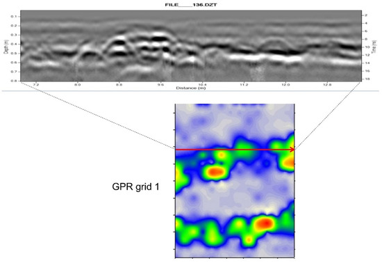 An archaeological GPR survey of the Mission Sonoma northern area is discussed in detail in a more extensive and comparative approach to geophysical interpretation at the site [23]. The partnership between State Parks, UC Berkeley, and the Federated Indians of Graton Rancheria tested the hypothesized extension of mission-era architecture beyond the current wall around park buildings. With a series of overlapped and offset geophysical prospecting grids north of the wall (Figure 21), several subsurface alignments were discerned, despite uneven overburden, clay-rich lenses of matrix, and construction fill. Figure 22 shows a cross-section of a confirmed [2] adobe brick wall over rubble with an adjacent tile floor.