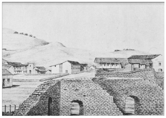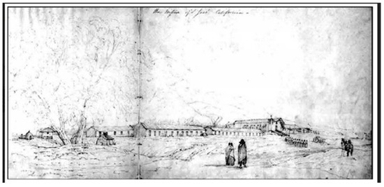 An early depiction of Mission San Jose’s long Native American quarters’ adobe architecture [22].