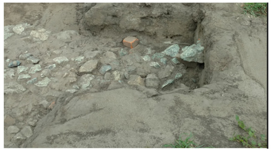 Much closer to the coast, yet contemporaneous with Mission Santa Clara, the Spanish quadrangle known as San Pedro y San Pablo, at what is now Sanchez Adobe County Park in Pacifica, was built in the 1780s at the location of the Native American village Pruristac in the San Pedro Valley. Sometimes known as the “Spanish Farm,” the compound was used actively by the Spanish mission system as an outpost for Mission Dolores for less than ten years. Subsequently the three-sided set of room blocks fell into ruin, though in the 1830s a new, two-story, adobe private rancho residence was constructed adjacent to the north wing. Reuse of building components for this and possibly other later structures has been identified through GPR survey and archival map research [17,18]. This updated research agenda has expanded greatly on what was known about this site from previous work. In 1978, archaeological excavations (Figure 8) were conducted at the Spanish quadrangle, exposing a large portion of the southern and eastern room blocks [19]. While adobe bricks are present in some areas, much of the structure was delineated by the presence of foundation stones.