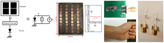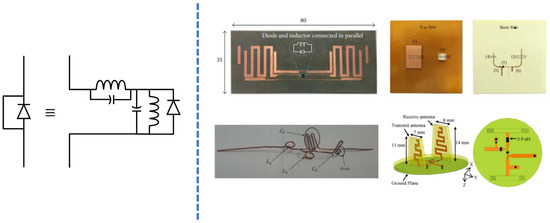 Here, is the residual phase noise and can be ignored for short distance approximation due to the range correlation effect [52]. Figure 9 shows the model of a passive diode-based tag and some of the tags utilized for this radar for ranging and motion detection in the presence of clutter.