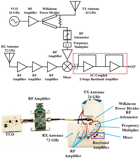 The sensitivity requirements for the sensor depend on the application and the maximum range that the radar needs to measure. For indoor applications, generally −70 dBm sensitivity can be used to detect 1 mm motion at a distance of 1 m in the 5.8 GHz ISM band for a transmit power of approximately 0 dBm. The radar’s sensitivity can be further improved by boosting the down-converted signal with a baseband amplifier with high gain. It should be noted that the baseband amplifier can only help in reducing the impact of quantization noise but not the SNR of the signal captured by the radar receiver.