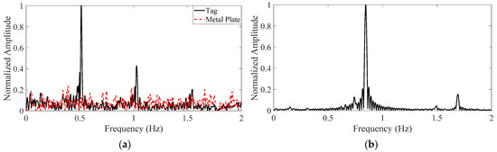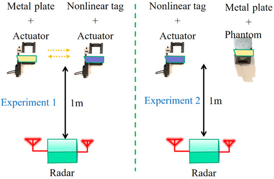 The experimental validation of the 3rd order harmonic radar was performed with two experiments, as shown in Figure 6. In the first experiment, tag and clutter, i.e., metal plates, were sequentially moving with equal motion amplitude and frequency. In the second experiment, the tag and clutter were moving simultaneously with unequal amplitude and frequency. The motion of the clutter was larger than the motion of the tag. The phantom shown in Figure 6 is a mechanical device used to mimic human breathing, and the actuator is a mechanical device used to produce sinusoidal motion, where the frequency and amplitude can be programmed. Figure 7a shows the result of the first experiment, and Figure 7b shows the result of the second experiment. Both of these experiments shows that the radar successfully suppressed the motion of clutter.