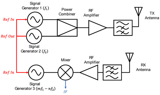 When two or more frequency tones are passed through a nonlinear device, the device produces additional frequency tones in addition to fundamentals and harmonics. These additional tones are called intermodulation. The discussion here is limited to odd-order intermodulation products. These intermodulation products are produced at , where and are the two fundamental tones illuminating the nonlinear device. The order of the intermodulation is . Figure 8 shows the block diagram of an intermodulation radar. Here, three signal generators are generally utilized: two signal generators to generate fundamental frequency tones and for transmitting into the environment, and a third signal generator at for down-converting the received tones to extract Doppler or range information of the nonlinear target. Generally, the third signal generator is tuned to 2 or as these frequency tones have the highest power levels among the nonlinear response within the same band.