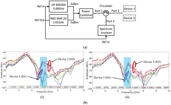 The intermodulation responses were utilized in authenticating two similar devices having identical components and matching circuits. In work [57], the intermodulation return signal from the nonlinear device was recorded. Figure 11 shows the measurement setup for transmitting the fundamental response to the nonlinear targets and recording their fundamental and intermodulation return. Two signal generators were used to transmit the two frequency tones towards the power combiner, and the output of the power combiner was sent towards the circulator. The circulator was connected to send signals from Port 1 to Port 2 and Port 2 to Port 3. Thus, the nonlinear devices were connected sequentially to Port 2 and the return signal from these devices was recorded on a spectrum analyzer connected to Port 3. The fundamental return signals, when used for authenticating these two devices, have a minimal difference in power level. Thus, they were discarded; however, when the 3rd order nonlinear responses were utilized for differentiating these two devices, the power level trend showed a similar trend for most of the frequencies. At a particular frequency band, the difference in power level was significant. In this work, a power level difference of more than 10 dB was considered to be significant. Figure 11b shows the nonlinear return signal from the two devices from 4 to 10 GHz, with as 10 MHz and a step size of 100 MHz. The power level was set as 5 dBm at 5 GHz for both tones.