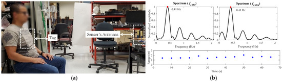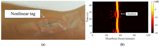 In [58,59], a thirty-six-element tag was used to record the strongest heartbeat pattern. However, this thirty-six-element tag is not practical to be utilized in all scenarios. Thus, a smaller tag was designed by placing a dipole antenna across the diode’s terminals and a wire loop connecting both the diode’s ends for biasing purposes [60,61]. The tag was placed on the wrist aligned to the radial artery. Figure 14a shows the placement of the tag on the wrist for measuring the heartbeat. The wrist was placed in front of the radar in the near-field region to measure the heartbeat pattern. Figure 14b shows the spectrogram obtained when the tag was placed on the wrist and kept in the near-field region. The plot shows a strong heartbeat pattern. In [62], vital signs of the human target under different postures were recorded, such as sleeping, sitting with the wrist touching the torso, and sitting with the wrist not touching the torso. The radar was able to detect vital signs, especially heartbeat patterns, in all these scenarios. Error analysis was also performed on the heartbeat data recorded by the radar compared to the reference. It can be seen that the error was < under all the measurement scenarios.