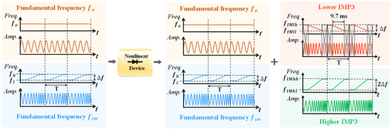 In the above works [53,54,55,56,57,58,59,60] on intermodulation-based nonlinear radars, only motion frequency could be obtained, and the radars could not be utilized for ranging purposes. In [61], the intermodulation radar was operated in frequency-shift-keying (FSK) mode. In this mode, of the tone was kept constant while of the tone was switched between two frequencies ; thus, corresponding to the switching of , the lower 3rd order tone was generated at two frequencies, i.e., and . A tag was placed on the target, so the tag backscattered the intermodulation response added with Doppler based on the incident fundamental tones. The radar sensor down-converts the received intermodulation response with a copy of the 3rd order tone at the mixer.