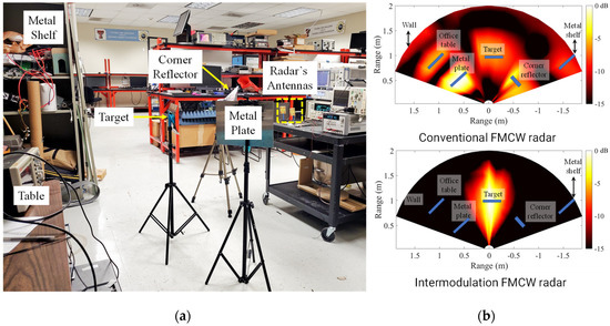 (a) Measurement setup; (b) mapping with intermodulation radar and comparison with a conventional FMCW radar [62]. Reproduced with permission from Mishra, A., Wang, J., Rodriguez, D., and Li, C., Utilizing Passive Intermodulation Response of Frequency-Modulated Continuous-Wave Signal for Target Identification and Mapping by IEEE, 2021.