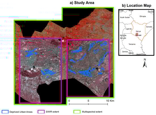 Nonetheless, the potential of EO data to analyze DUAs at large geographic scales brings its own limitations and must be further explored [], despite efforts to link EO data and socio-economic elements [,,,]. There have been only limited attempts to create parsimonious and transferable models as most EO studies focus on small urban snippets while not accounting for the complexity of the applications []. Moreover, as DUAs can be highly heterogeneous within a city, an appropriate adaptation of existing mapping frameworks to accurately depict them is necessary. This relates to the selection of the classification scheme (i.e., including classes such as waste piles) as well as tackling frequently encountered challenges, such as limited data availability and transferability of city-wide applications, as well as increasing our understanding of the remotely sensed data that are needed to achieve these goals. As such, by using Nairobi, Kenya, as a case study we go beyond the current state of the art and investigate a novel, multifaceted set of objectives: