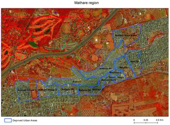 Over the past few decades, Sub-Saharan Africa (SSA) has been facing an extensive and overwhelming population growth, mainly occurring in urban regions []. The lack of provisions to address this phenomenon has further exaggerated socio-economic fragmentation within cities [], leading to the proliferation of deprived urban areas (DUAs) that often lack basic services, such as access to clean water and sanitation, among others []. Within DUAs, urban dwellers are often exposed to unhealthy and unsuitable physical environments, with hazardous effects on their health. For instance, as pointed out by Aliu et al. [] in a case study on Lagos, Nigeria, residents of the most deprived areas of the city were surrounded by solid waste and stagnant water, which contributes to the degree of overall deprivation. Additionally, the issue of waste disposal and its effect on disease burden was demonstrated by Muoki et al. [] using, as a case study, the Mukuru slums of Nairobi, Kenya. In the current COVID-19 pandemic, DUAs are largely neglected and face a disproportionate epidemiological burden of diseases in comparison to more affluent neighborhoods []. Demonstrated difficulties to maintain social distancing and maintain necessary livelihood activities have been emphasized, while the disruption of global supply chains has led to food shortages in several of the most vulnerable and deprived areas [,,,]. The situation is a matter of great concern, considering the fact that the number of dwellers residing in these areas often represent the majority of a city’s population and is likely highly underestimated []. For example, in Nairobi DUAs occupy less than five percent of the city extension but are home to more than sixty percent of the population [].